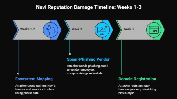Week −3 | Supply Chain Compromise Spear-phishing email sent to employees at a Navi vendor. Fake “onboarding portal” harvests email credentials. Attacker begins monitoring vendor-Navi correspondence silently.