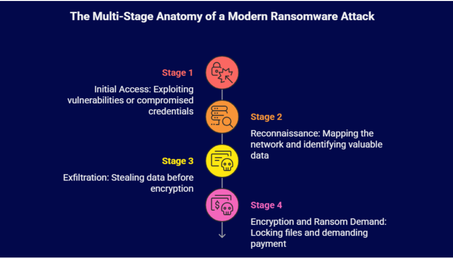 Understanding the anatomy of an attack helps you recognise and stop it before it’s too late. Modern ransomware doesn’t just encrypt your files and disappear. It’s sophisticated, multi-stage, and often running silently in your systems for days or weeks before you even know it’s there.